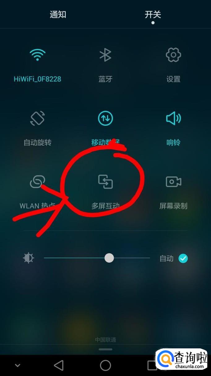 也是打开手机下拉通知栏,在开关上将多屏互动打开。