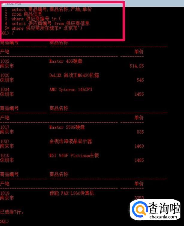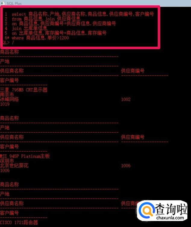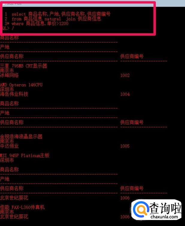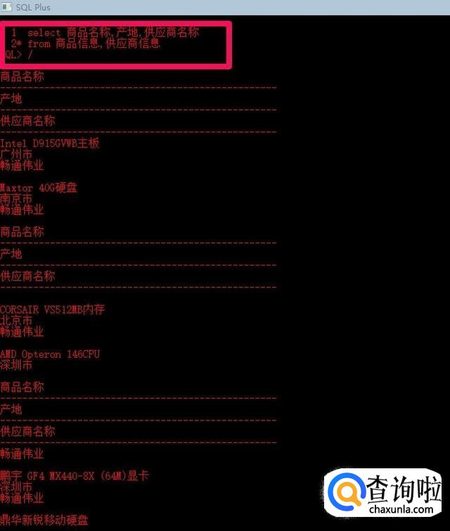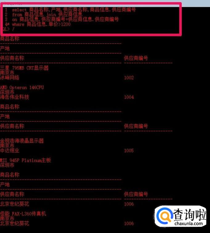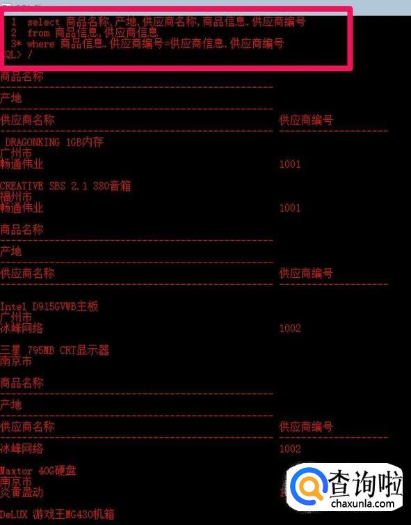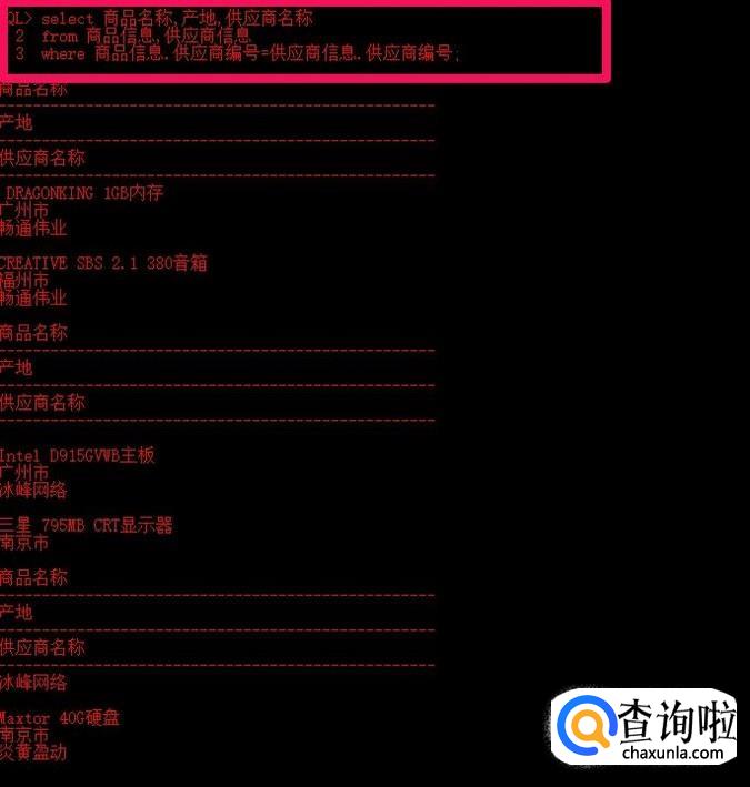 在简单查询中我们一般只使用了from字句的一个表,然而在关系数据库中,表与表之间往往是存在关系的,这就是要求从多个表中检索数据,以输出更有意义的结果。最简单的连接方式就是在select语句中,通过from子句使用多个表,并用逗号将不同的基本表隔开。下面语句将商品信息表和供应商信息表连接起来,查询其中的商品名称,产地,供应商名称。