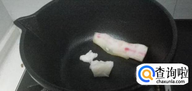 生肥猪肉下锅,用厨用夹按住生肥猪肉,以内圈到外圈的方式呈螺旋状在锅内壁不停地擦拭,使溢出的油脂均匀地布满整个锅面。
