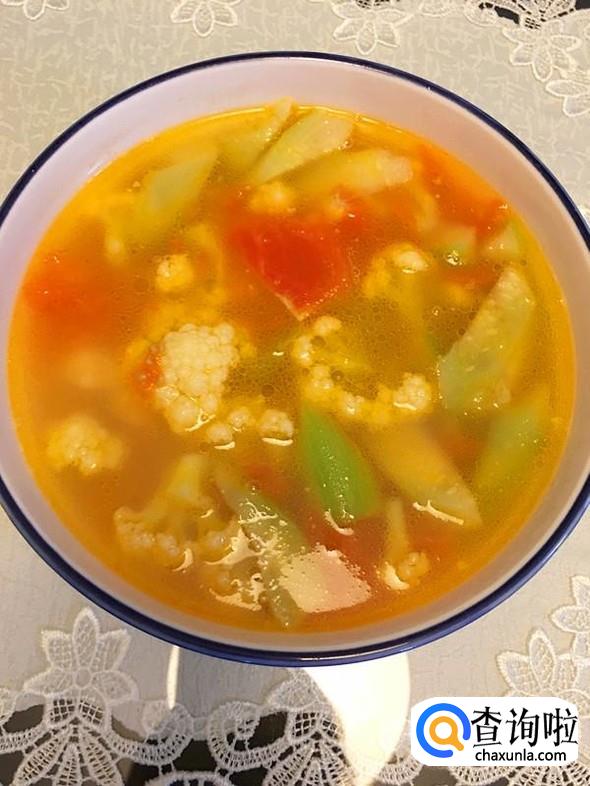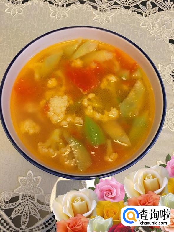 番茄和丝瓜都有一定的美容护肤作用,既能增白皮肤,消除色斑,更能抵抗衰老,番茄和花菜还对乳腺癌具有一定的预防作用。因此,这道蔬菜汤尤其适合女性朋友,经常食用,具有很好的养生功效。