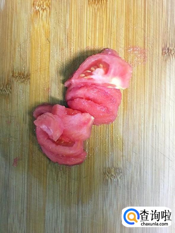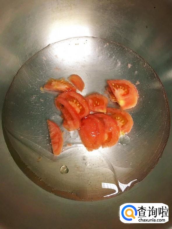 锅中加入适量水,再放入少许食用油,大火烧开后放入切成薄片的番茄。