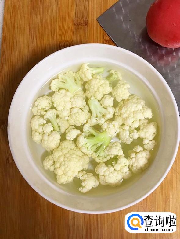 花菜冲洗干净后掰成小朵,放入淡盐水中浸泡5分钟左右。