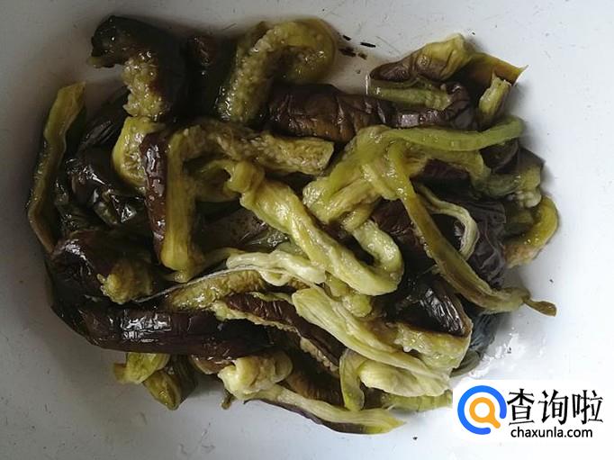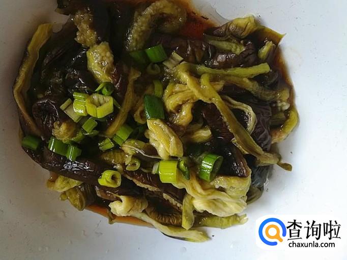 把搅拌均匀水缓缓的淋入撕好的茄条上,搅拌均匀即可。