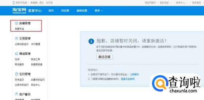 点击左侧的“店铺管理”下的“我要开店”。如果曾经开过淘宝店的用户可以选择“激活店铺”进行重新开店。