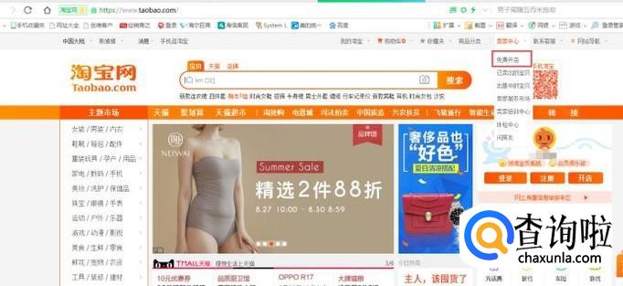 登录淘宝网的官网,点击“卖家中心”的下拉框选项“免费开店”。