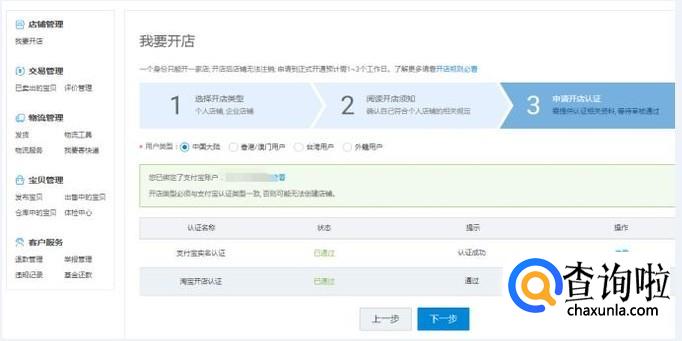 首先先选择所需要开店的的类型,在开店中需要将支付宝进行实名认证,还有就是淘宝开店认证,根据要求上传身份证证件,脸部识别就可以了。