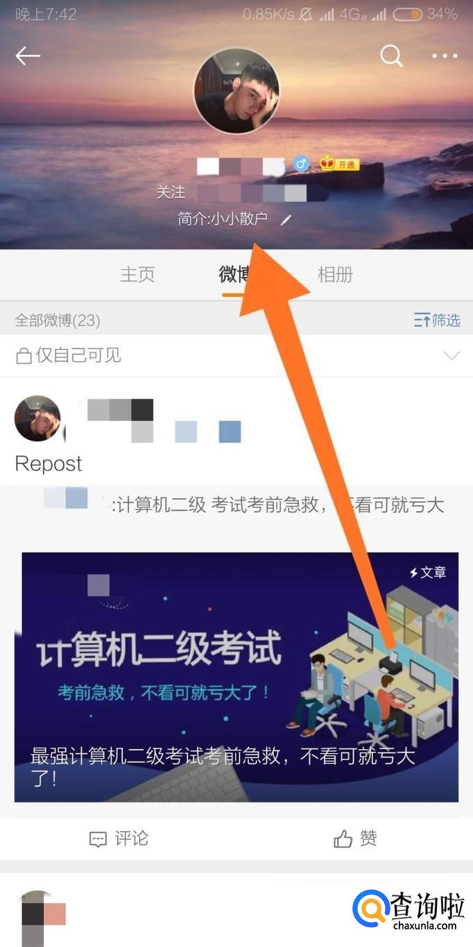 进入个人微博首页后,点击“简介”区域。