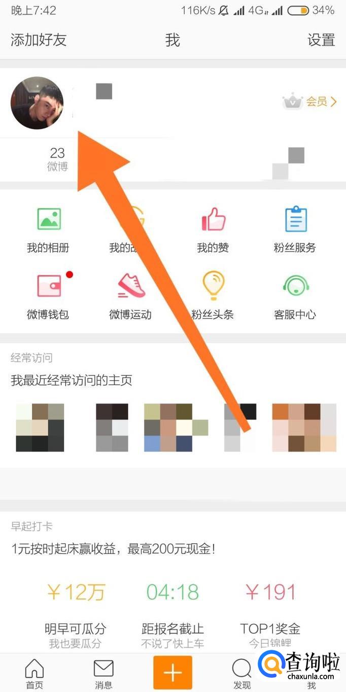 首先进入手机微博客户端页面“我”,然后点击左上角的微博头像。