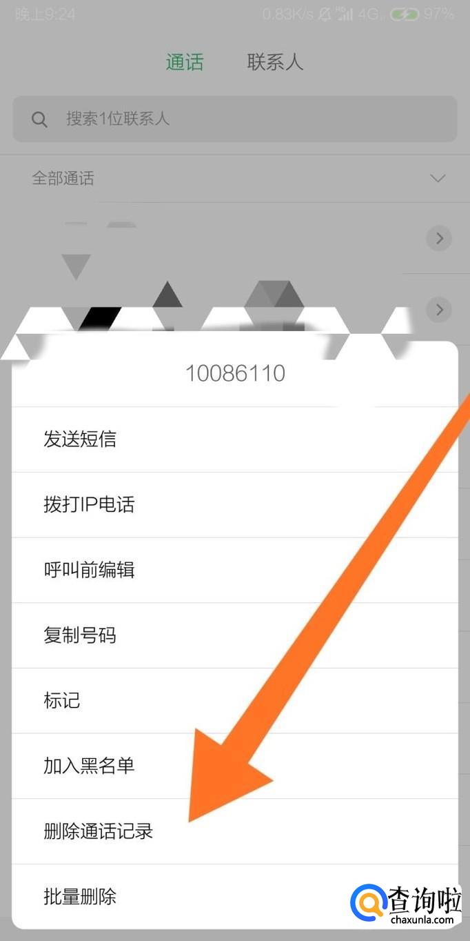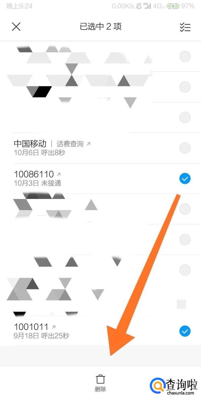选择“批量删除”选项后,勾选需要删除的通话记录,接着点击屏幕底部的删除按钮即可。