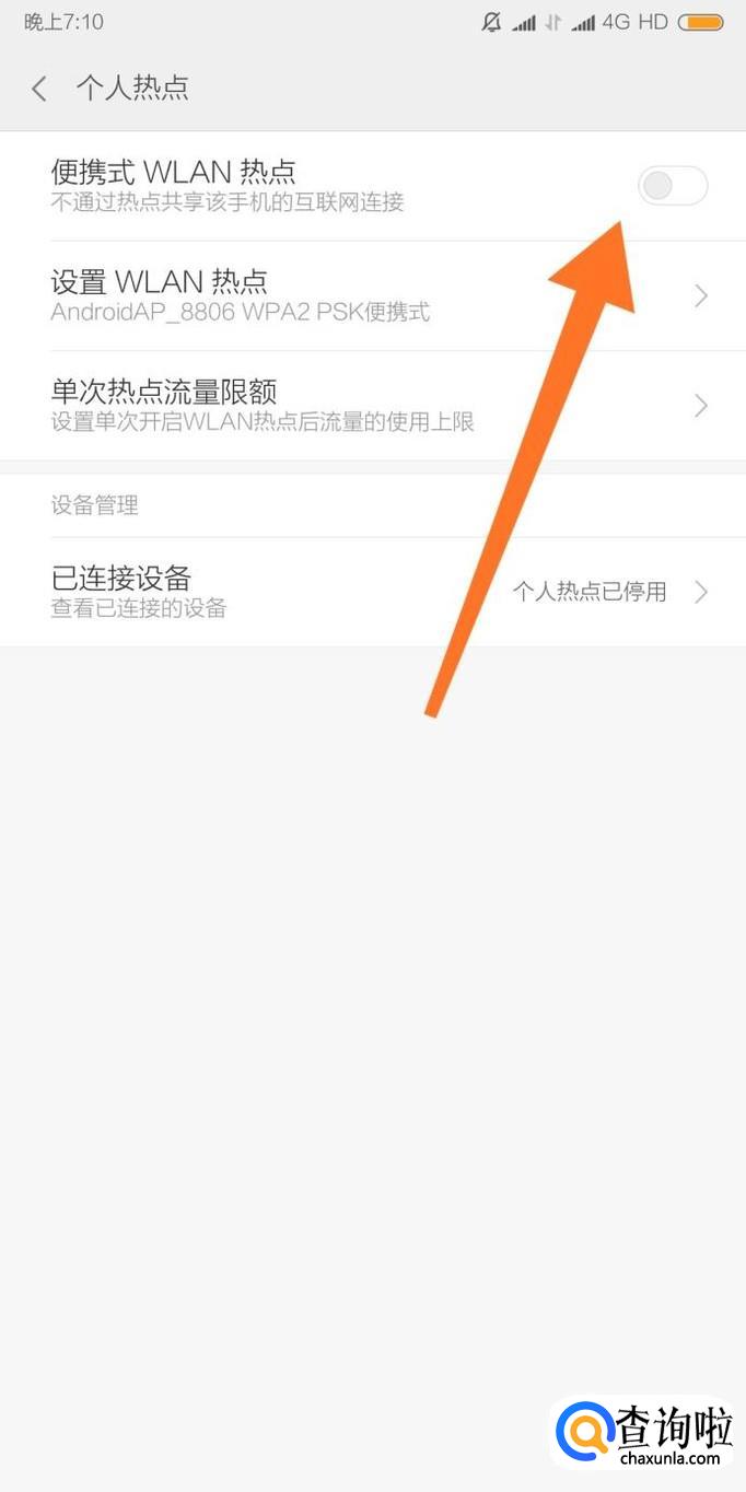 打开“便携式WLAN热点”选项后,其他设备就可以通过WIFI来连接上手机提供的网络。