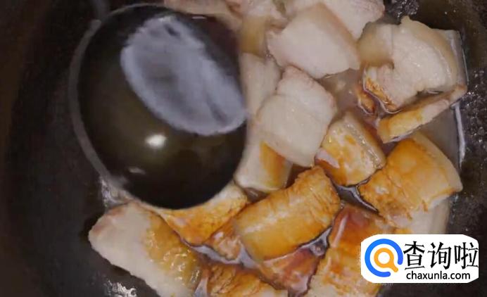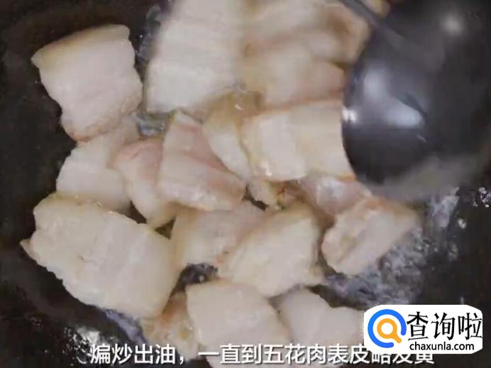 然后下大块的五花肉,煸炒出油,一直到五花肉表皮略发黄。
