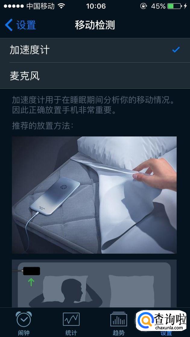 用户初次使用时,只需要把手机放在枕边,把手机反过来后他就会自动检测,还可以调节加速度。