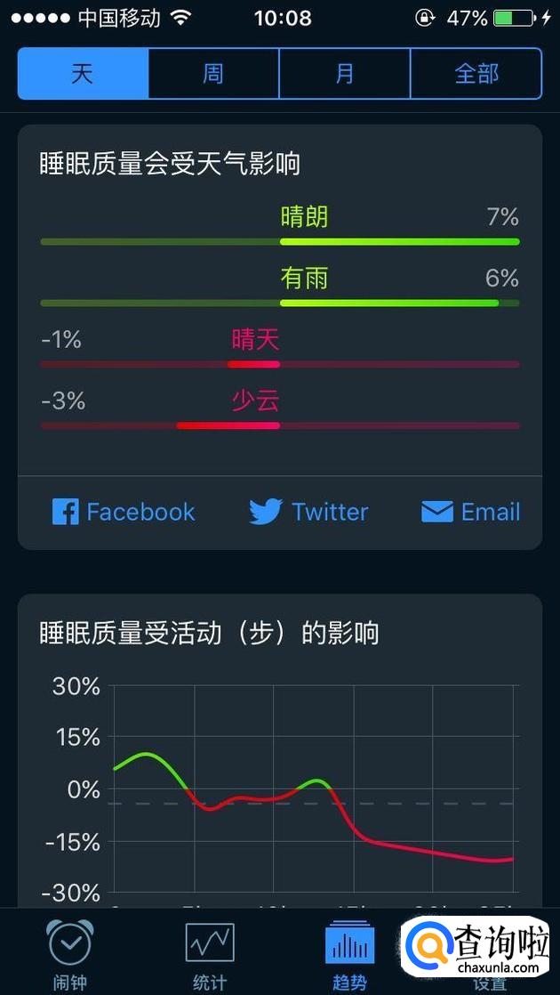 打开趋势统计表,里面有“天、周、月和全部”四种,统计的内容有:基本睡眠情况、提高和降低睡眠等等,如图所示。
