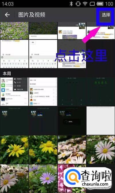 此时,手机会显示出您与好友聊天中曾出现过的图片,点击【选择】。