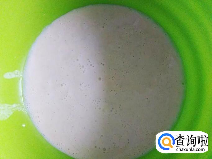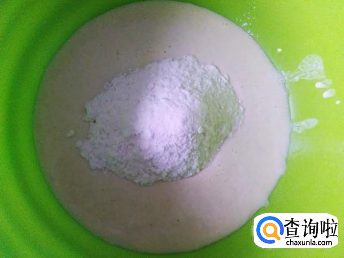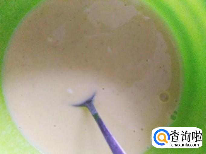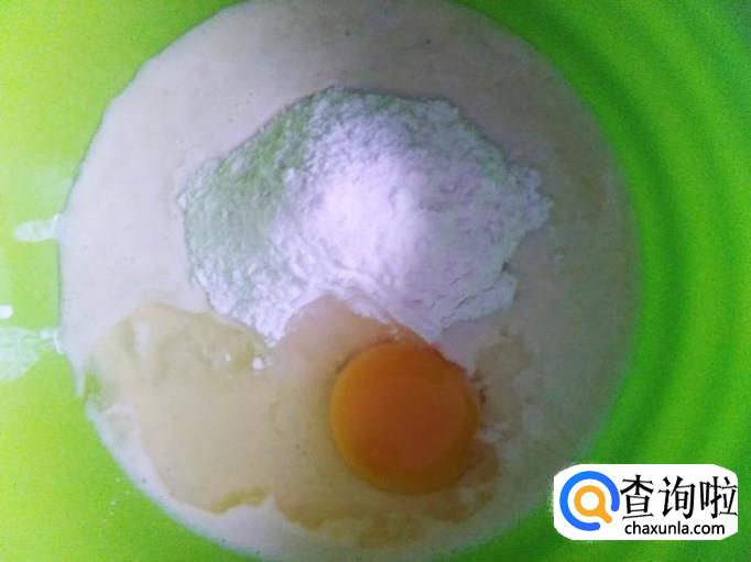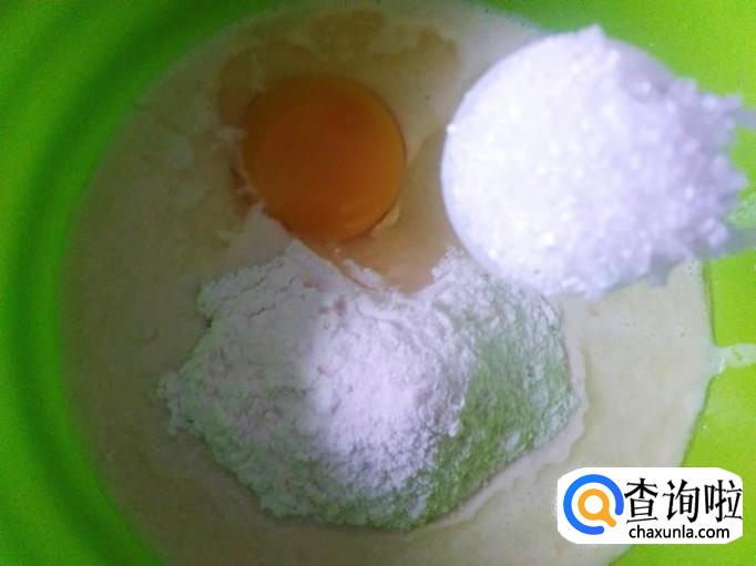 倒到盘里,加30克面粉打1个鸡蛋进去,加适量的白糖。