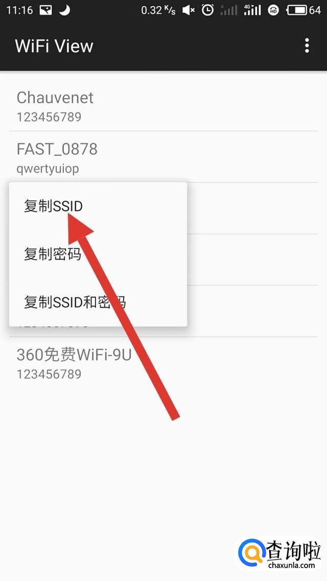 长按热点名称,点击复制热点密码,将密码复制到剪贴板。