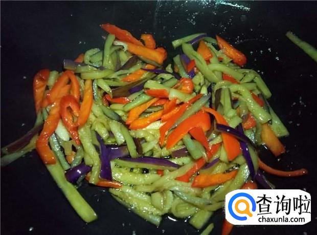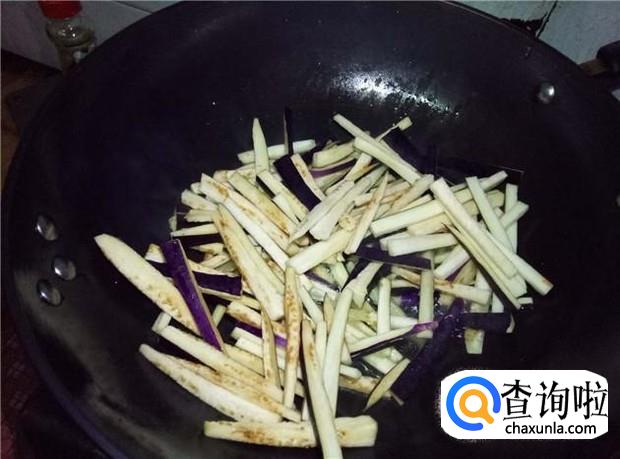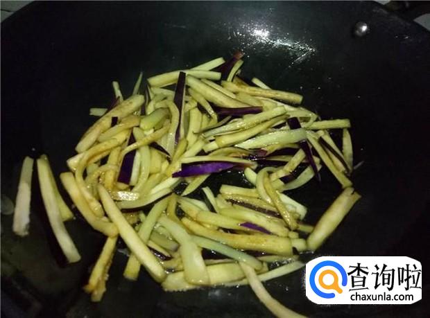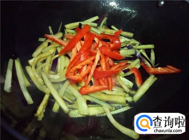 茄子炒到八分软,再加入红辣椒丝,加入适量的盐,把红辣椒炒熟即可。