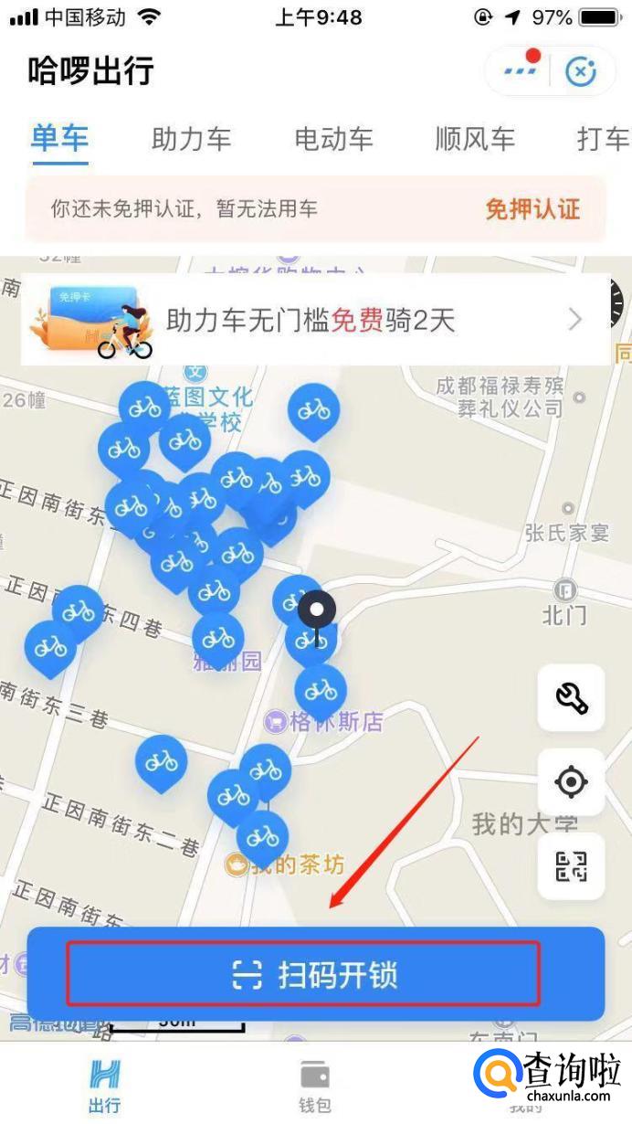 然后在弹出界面点击“扫码开锁”,扫描共享单车上的二维码,共享单车就会开锁,就可以开始骑行了。