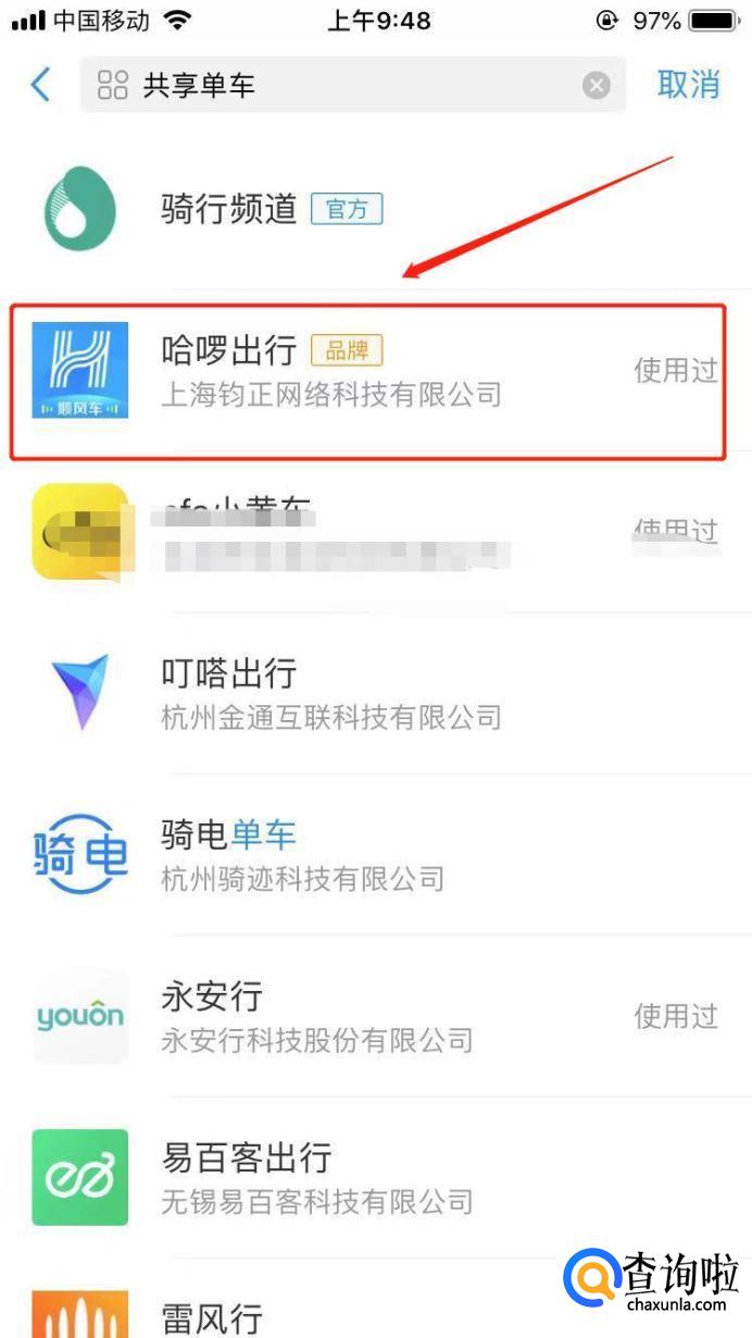 首先找到共享单车停放的位置,打支付宝,搜索共享单车,在弹出界面点击“哈啰出行”。