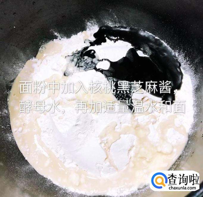 面粉中加入核桃黑芝麻酱和酵母水,之后加入适量的温水和成面团,如下图所示。