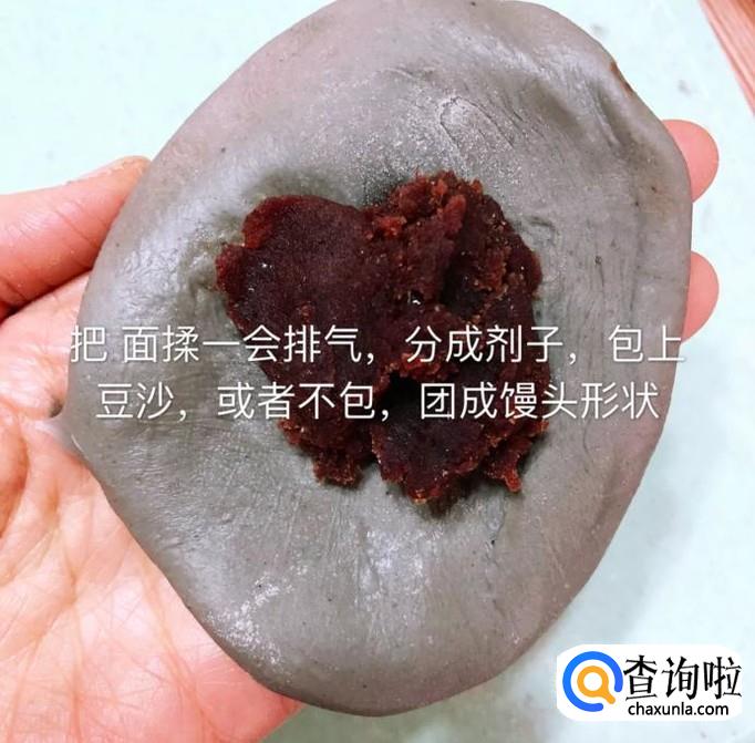 接着把面揉一会儿排气,分成剂子,包上豆沙,做成馒头的形状,如下图所示。