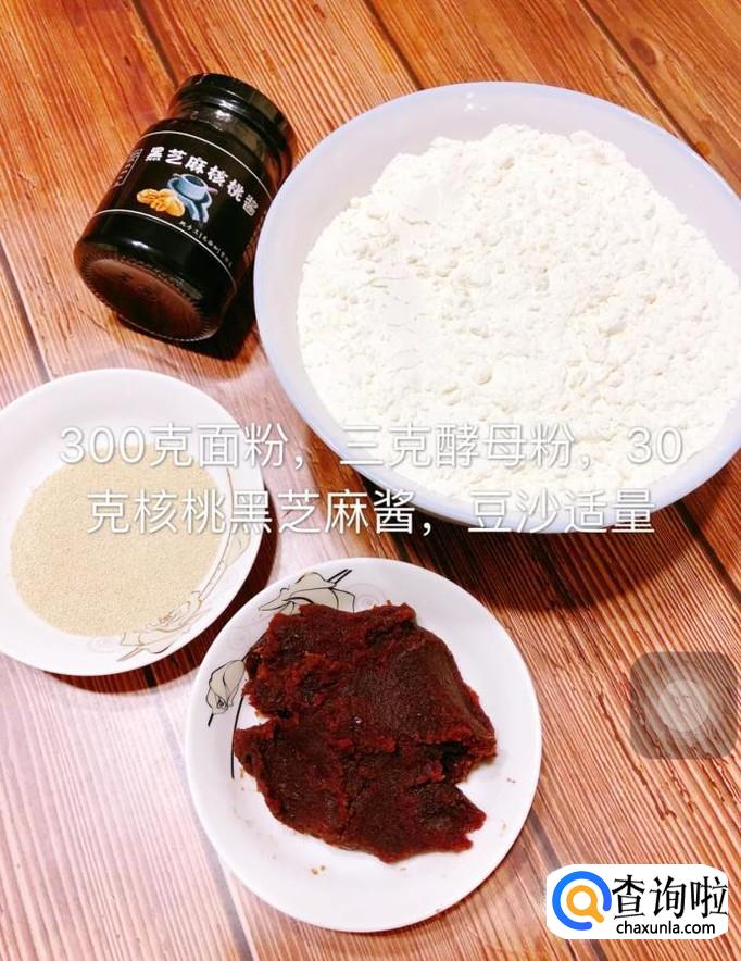 首先准备好要用到的所有食材,如下图所示。小贴士:面粉300克,酵母粉3克,核桃黑芝麻酱30克,豆沙适量。
