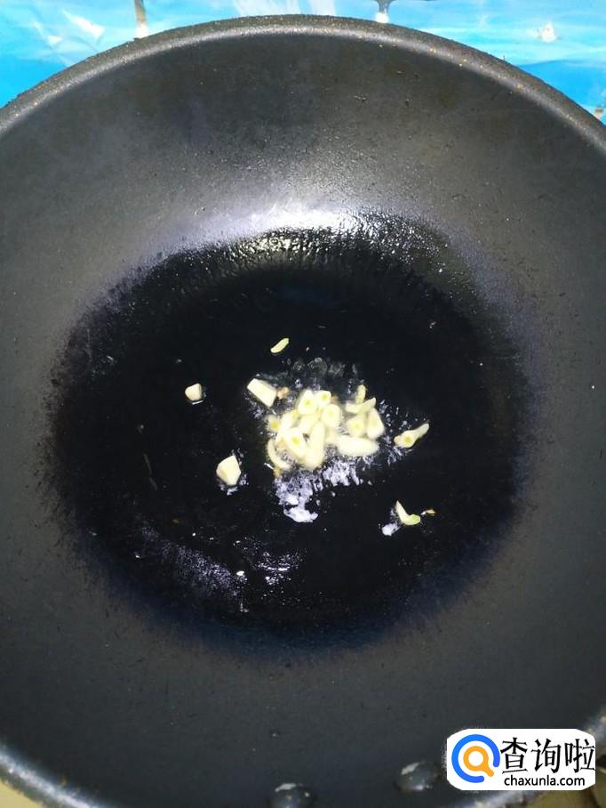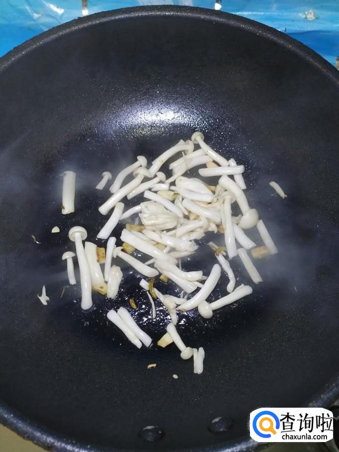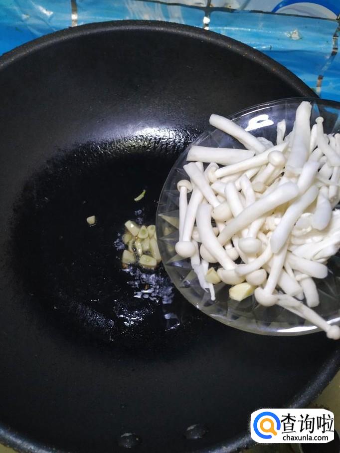准备适量大蒜,去除外衣后,切片备用,炒锅中放入适量油,油热后,将蒜片放入锅中炒香,然后将白玉菇放入锅中翻炒均匀。