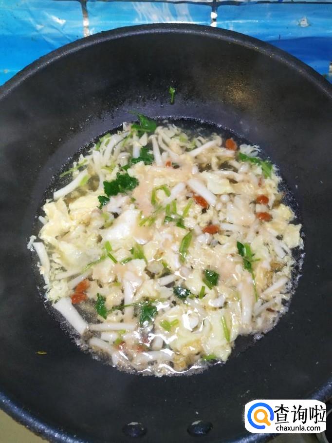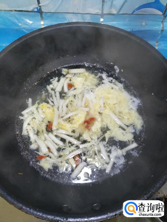 水开后,将鸡蛋液淋入锅中,等待定型后,用勺子稍微搅拌一下。再准备适量泡发好的枸杞子,撒入锅中。