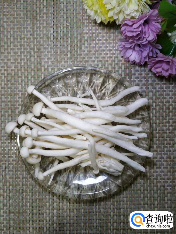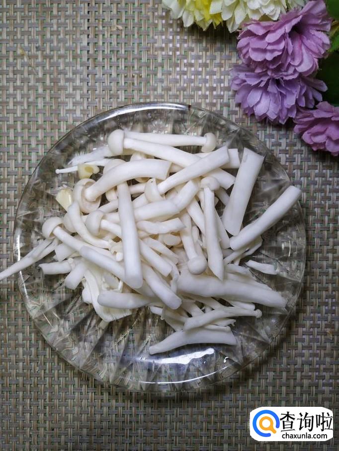 准备适量白玉菇,用清水洗净后,切成段,放入盘中备用。