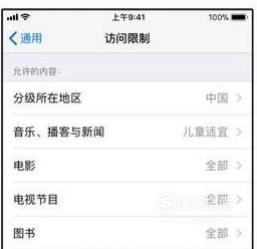 在互联网内容参差不齐的环境下,在iPhone的“访问限制”中可通过设置,阻止播放并下载包含儿童不宜内容的音乐,以及具有特定分级限制的影片、应用或电视节目,如图:
