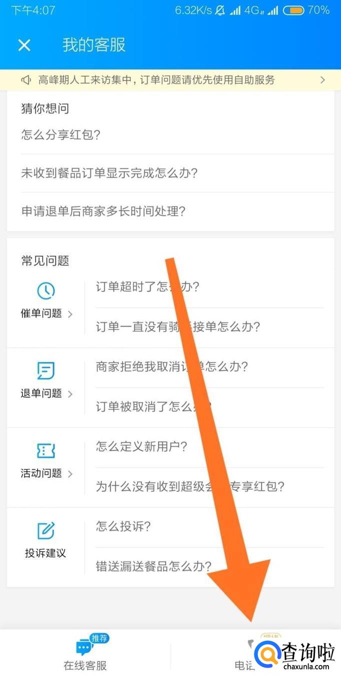 如果是在比较紧急的情况或者用文字难以描述清楚的时候,就可以直接点击“电话客服”图标,直接语音联系饿了么人工客服。