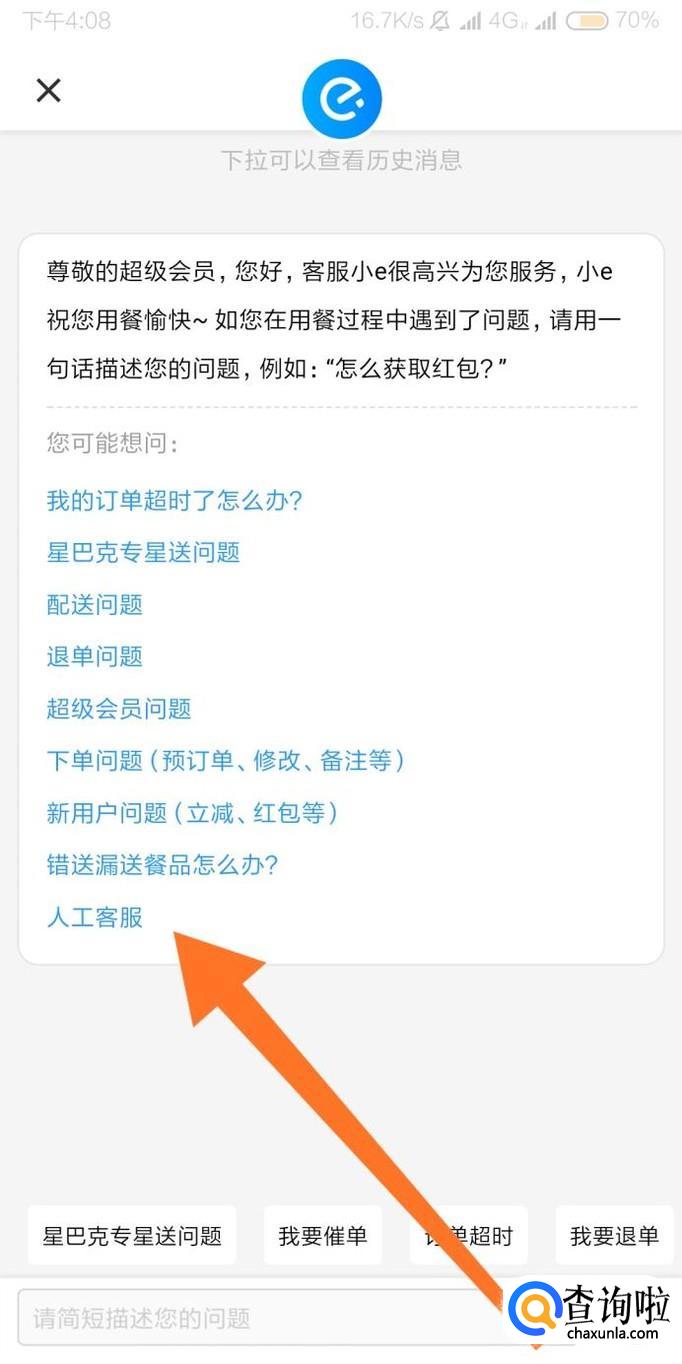 进入在线客服咨询页面后,点击“人工客服”字样就会直接联系到饿了么的人工服务了。