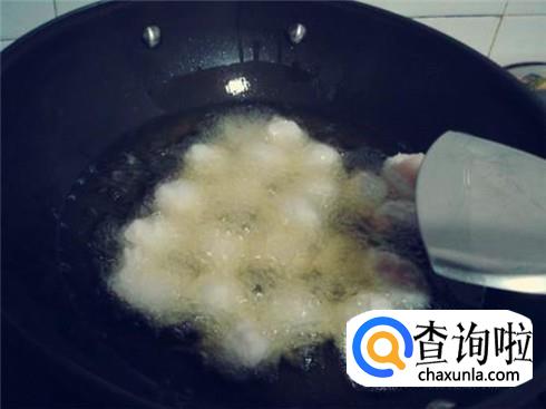 锅里倒油,要多一些,烧热之后把鱼丸放进去,要用小火,鱼丸一面炸的成型之后再翻一下,然后再用中火。