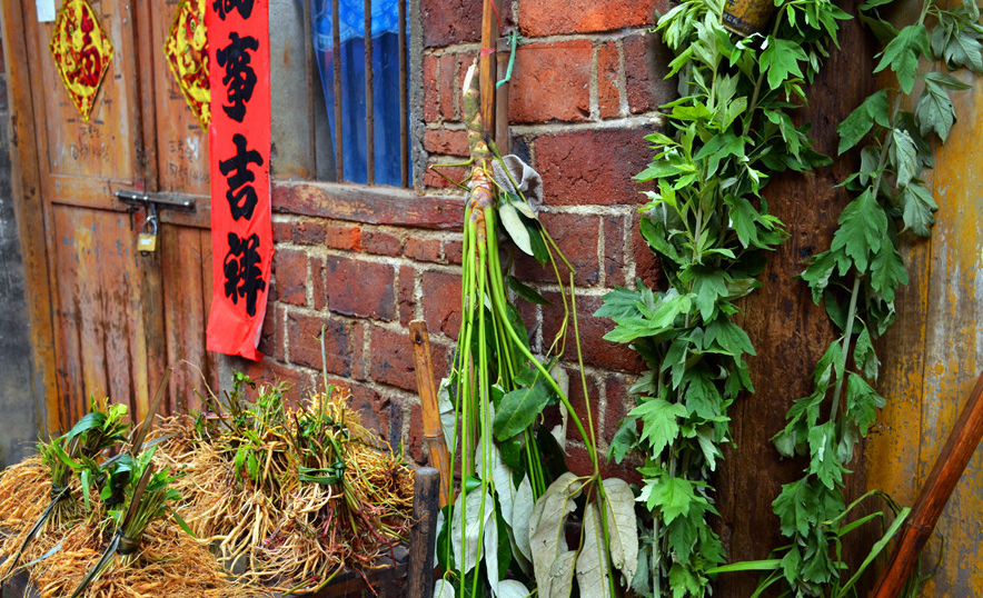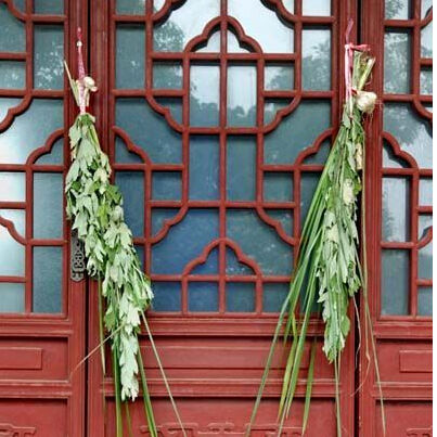 “手执艾旗招百福,门悬蒲剑斩千邪”。端午节在门口挂艾草、蒲草,就像贴上一道灵符,可以趋利避害。艾草代表招百福,是一种可以治病的药草,插在门口,可使身体健康。在我国古代就一直是药用植物,针灸里面的灸法,就是用艾草作为主要成分,放在穴道上进行灼烧来治病。有关艾草可以驱邪的传说已经流传很久,主要是它具备医药的功能而来,像宗懔的《荆楚岁时记》中记载曰“鸡未鸣时,采艾似人形者,揽而取之,收以灸病,甚验。是日采艾为人形,悬于户上,可禳毒气。”