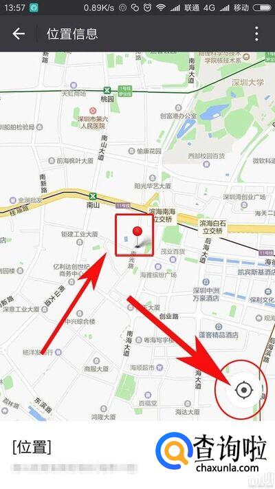 打开分享的位置之后我们就可看到红的左边,代表对方在的位置,在手机屏幕下方还会显示对方具体位置文字信息,这时候我们点击地图右下角我的位置按钮,如图所示: