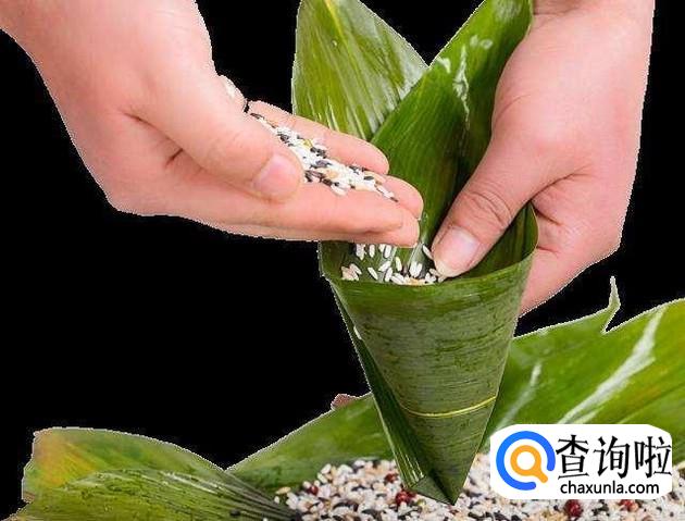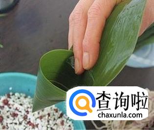 然后把煮好的粽叶折成斗型,然后把泡好的糯米放到粽叶里面,然后把粽子叶折起来包裹一下,然后用绳子固定。