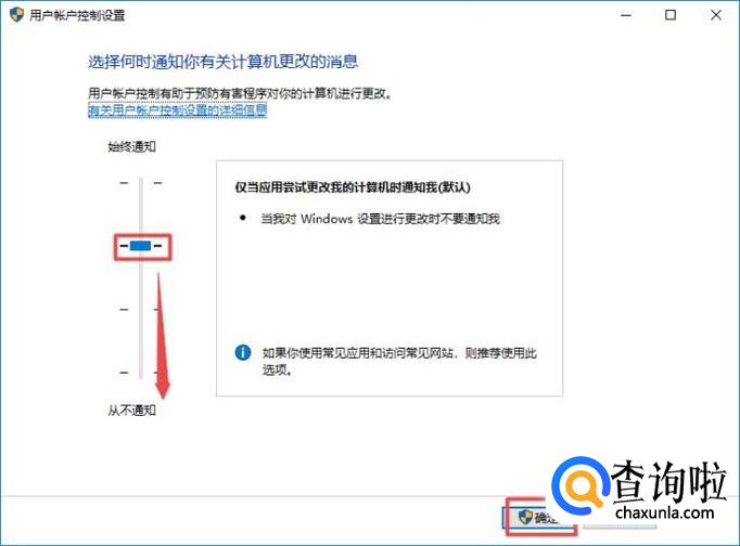 弹出的界面,我们将滑动按钮下滑到最下方,然后我们点击确定,这样就可以去除小盾牌图标了。