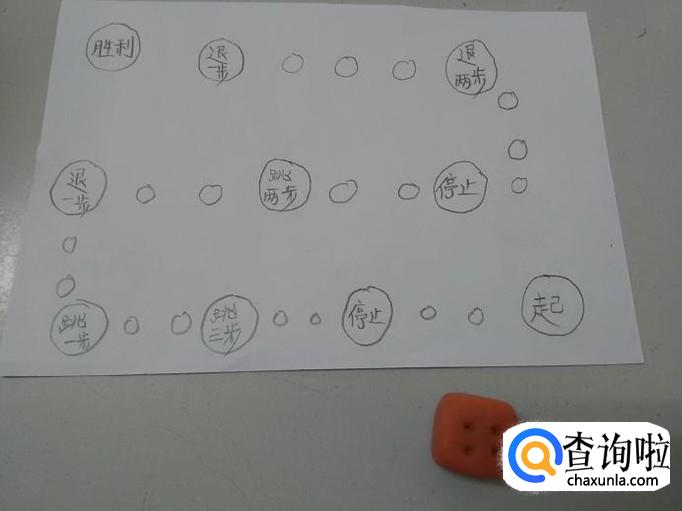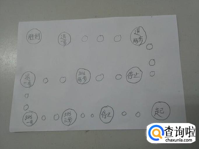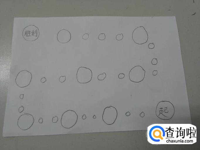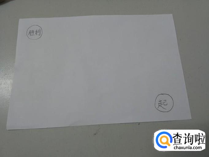 先在一张纸的右下角画一个圆圈,写上一个起字,表示游戏从这里开始,然后在纸的左上角再画一个圆圈,写上胜利二字,表示谁先走到这个圈里,谁就是胜利者。