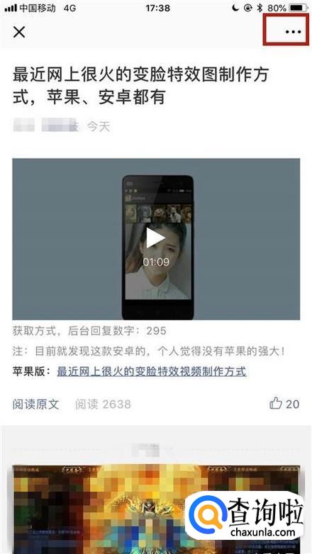 首先点击公众号中一个带有视频的文章,并点击屏幕右上方的三个点,如下图所示。