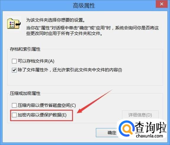 我们在高级属性对话框内找到加密内容以便保护数据选项,将其前面的复选框勾选,点击确定就设置了,如图所示: