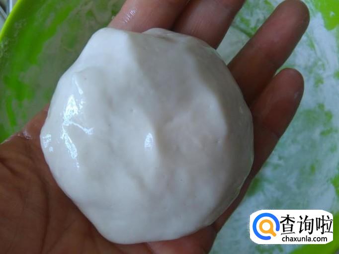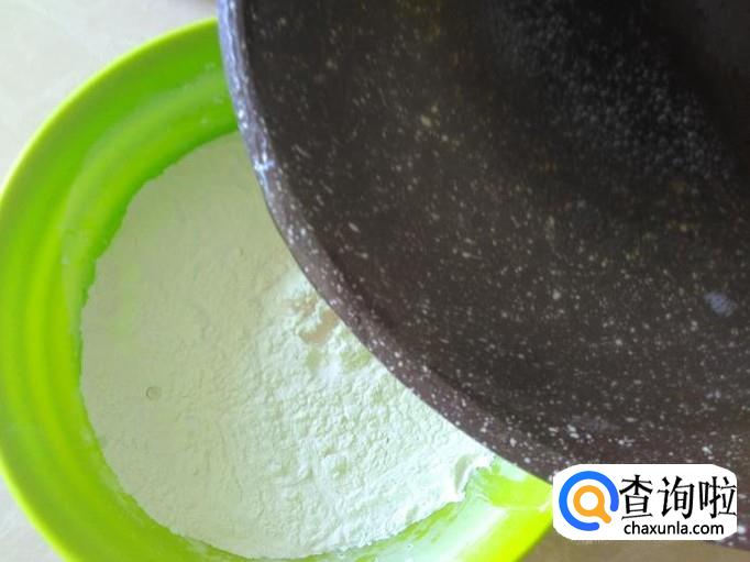 锅里装适量的水煮沸,然后倒到糯米粉里搅拌成粉团。【加开水的时候要一点点地加】