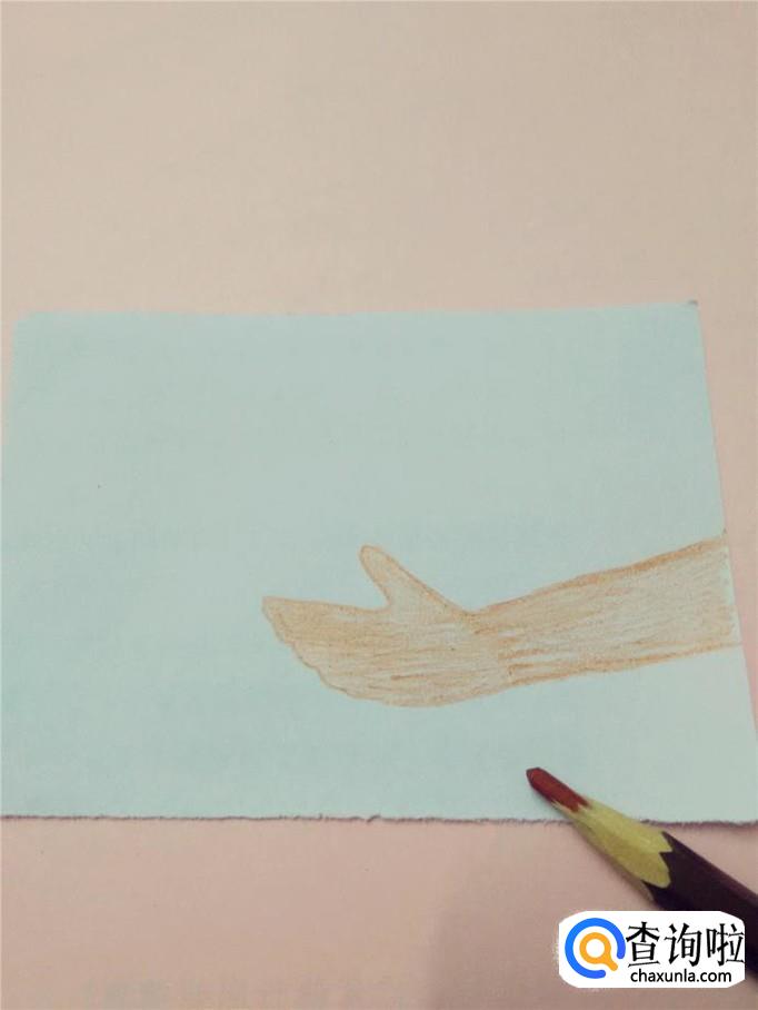 先用棕色在纸的右侧画一只大而有力的手臂,手心向上,四指并拢,大拇指和其他四指分开,这是父亲的手臂。