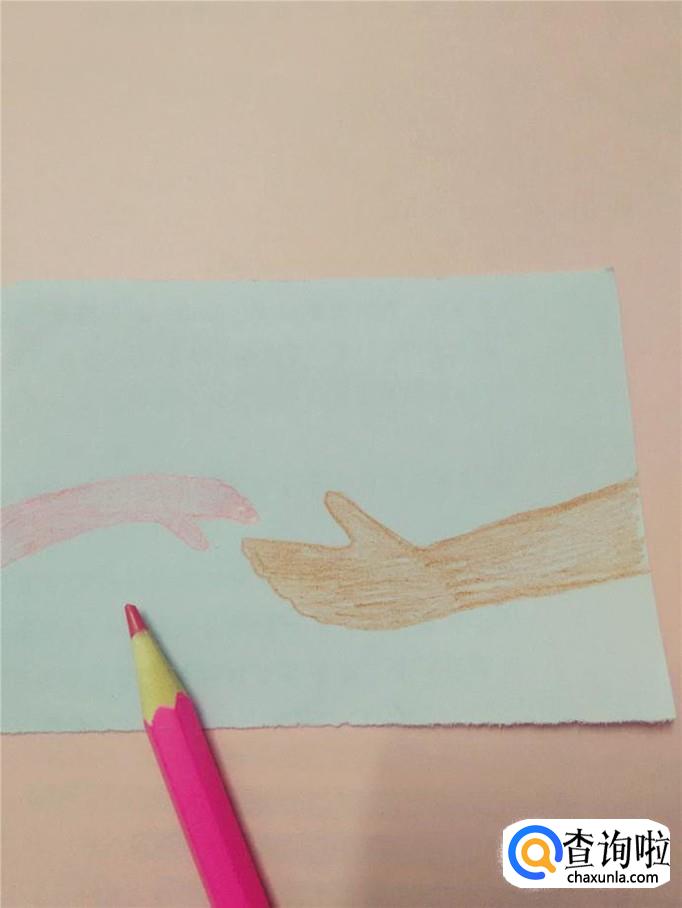 再用粉色在纸的左侧画一只较小的弱弱的手臂,手心向下,伸向父亲的手臂,也画成四指并拢,拇指分开,这是孩子的手臂,与父亲宽大的手臂比起来,是那么弱小,需要父亲的保护和扶持。