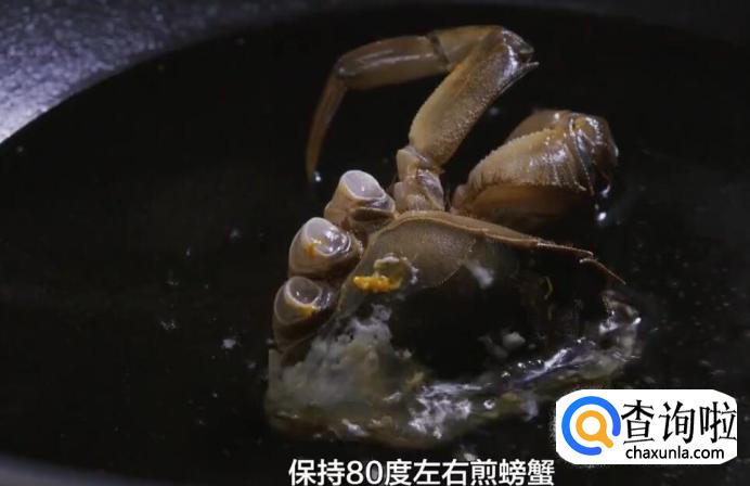 油温保存80°左右煎螃蟹,注意螃蟹要立放。