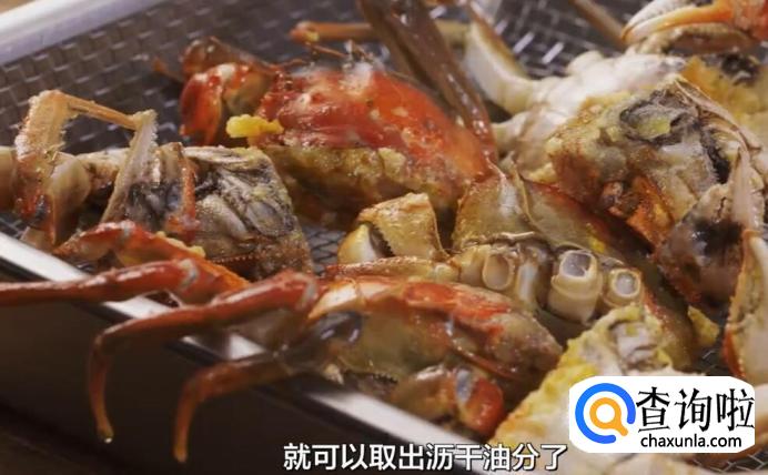 等两面蟹身都炸至金黄色,就可以取出沥干油分了。
