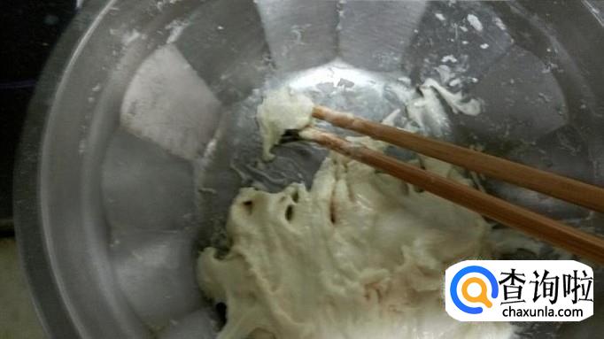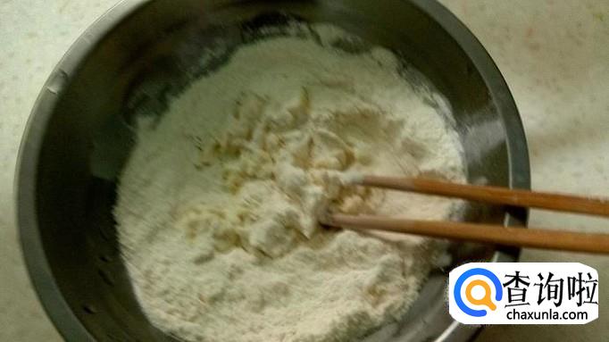 菜都备好后,我们就调制一下一会要用的疙瘩汤面团。取适量面粉,加入一点纯净水用筷子搅拌一会,感觉干就再加一点水,再次用筷子搅拌,直至如图几乎成了面团就好。