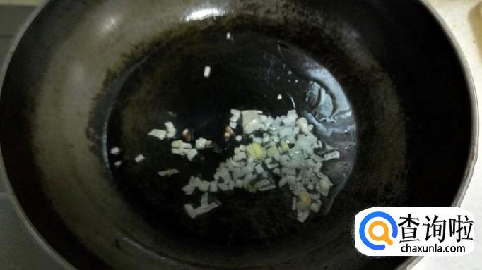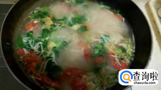 炒锅放少量花生油,热锅凉油,放入葱花炝锅,分别倒入备好的金针菇和西红柿,快速翻炒片刻,加入适量水。