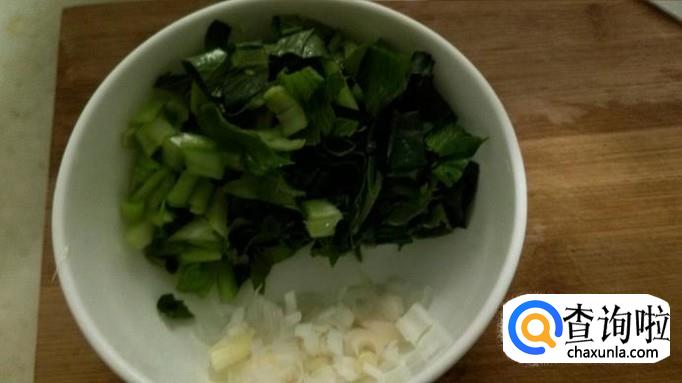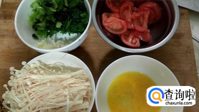 把洗净的的油菜切碎,葱切末,西红柿切块,金针菇切从中间切一刀,分两段待用,一个鸡蛋打好放碗里备用。