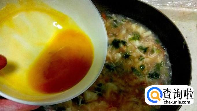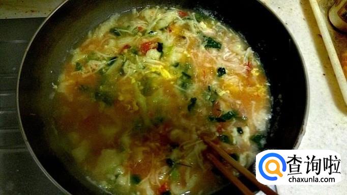 把疙瘩都放进锅里后,一般煮3-5分钟,疙瘩大怕不熟就多煮会 ,基本熟了后倒入打好的鸡蛋搅匀,从锅边转一圈倒入鸡蛋液,用筷子划动搅一下,蛋花浮在汤面就好。