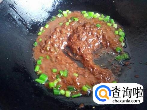 接着放入调好的黄酱,翻炒使其颜色变深。
